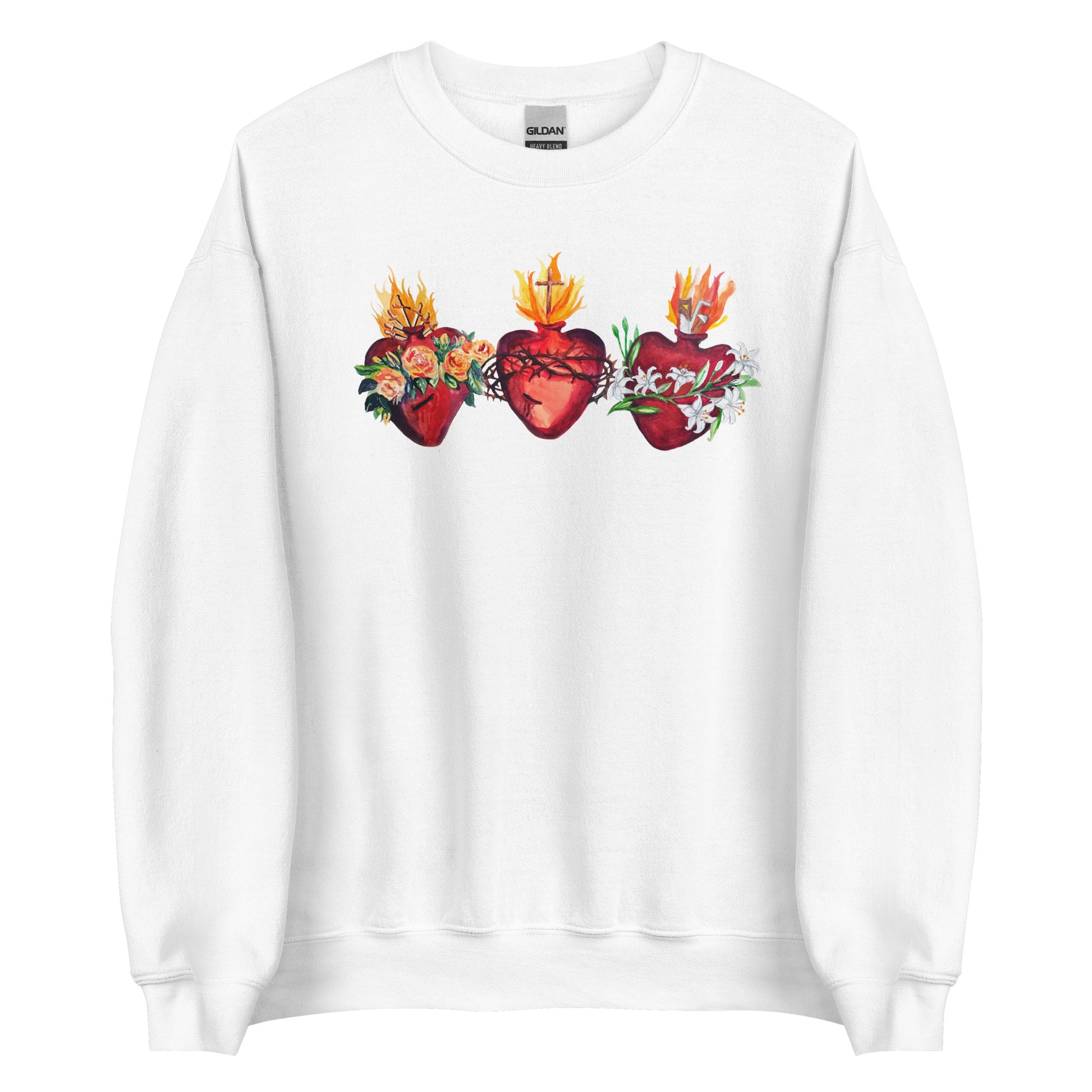 A sturdy and warm sweatshirt bound to keep you warm in the colder months. The image shows the Hearts of the Holy Family. Have the Hearts of Mary, Jesus, and Joseph close to you and those you love!
