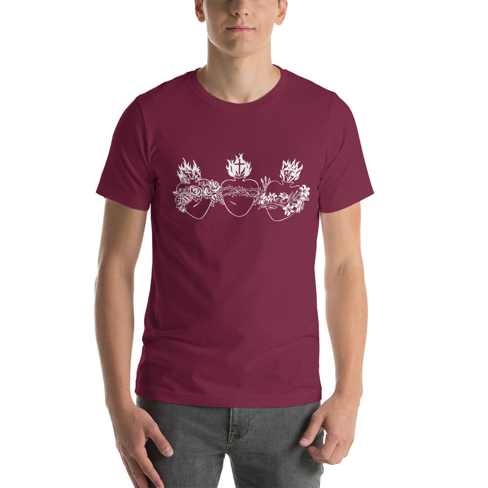 This t-shirt feels soft and lightweight, with the right amount of stretch. It's comfortable and flattering for all. The image shows the Hearts of the Holy Family. Have the Hearts of Mary, Jesus, and Joseph close to you and those you love!