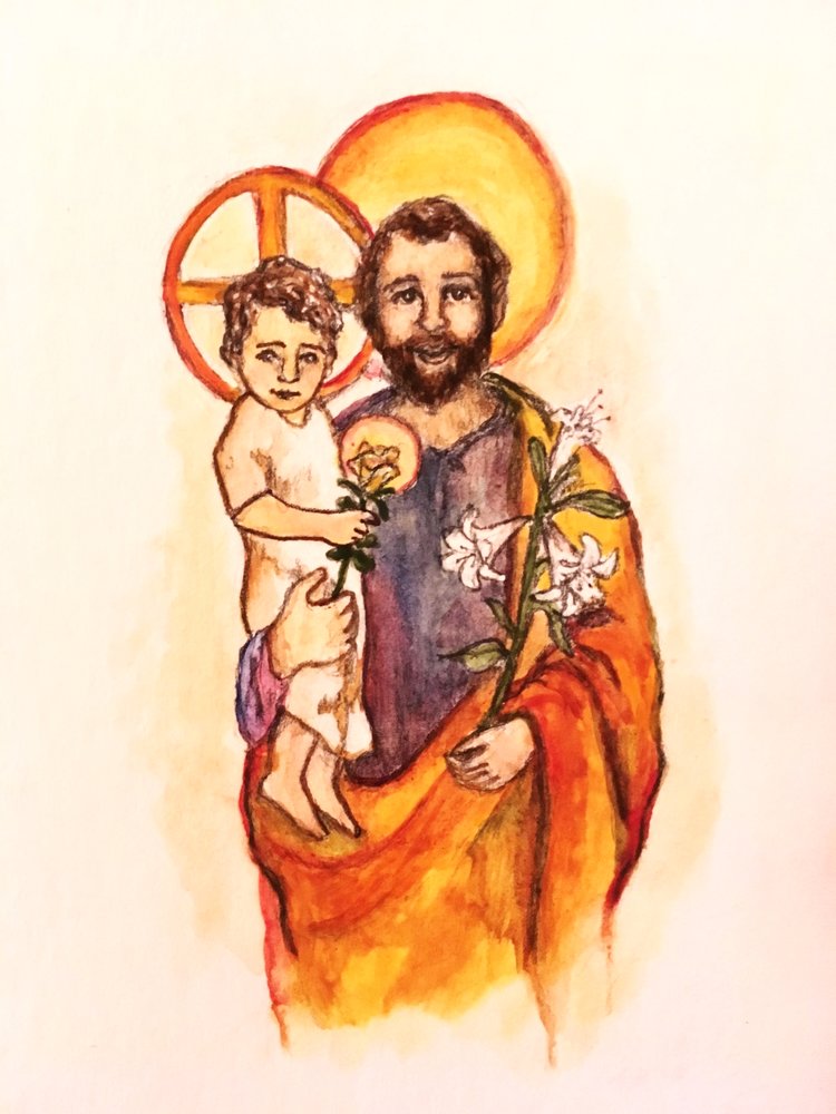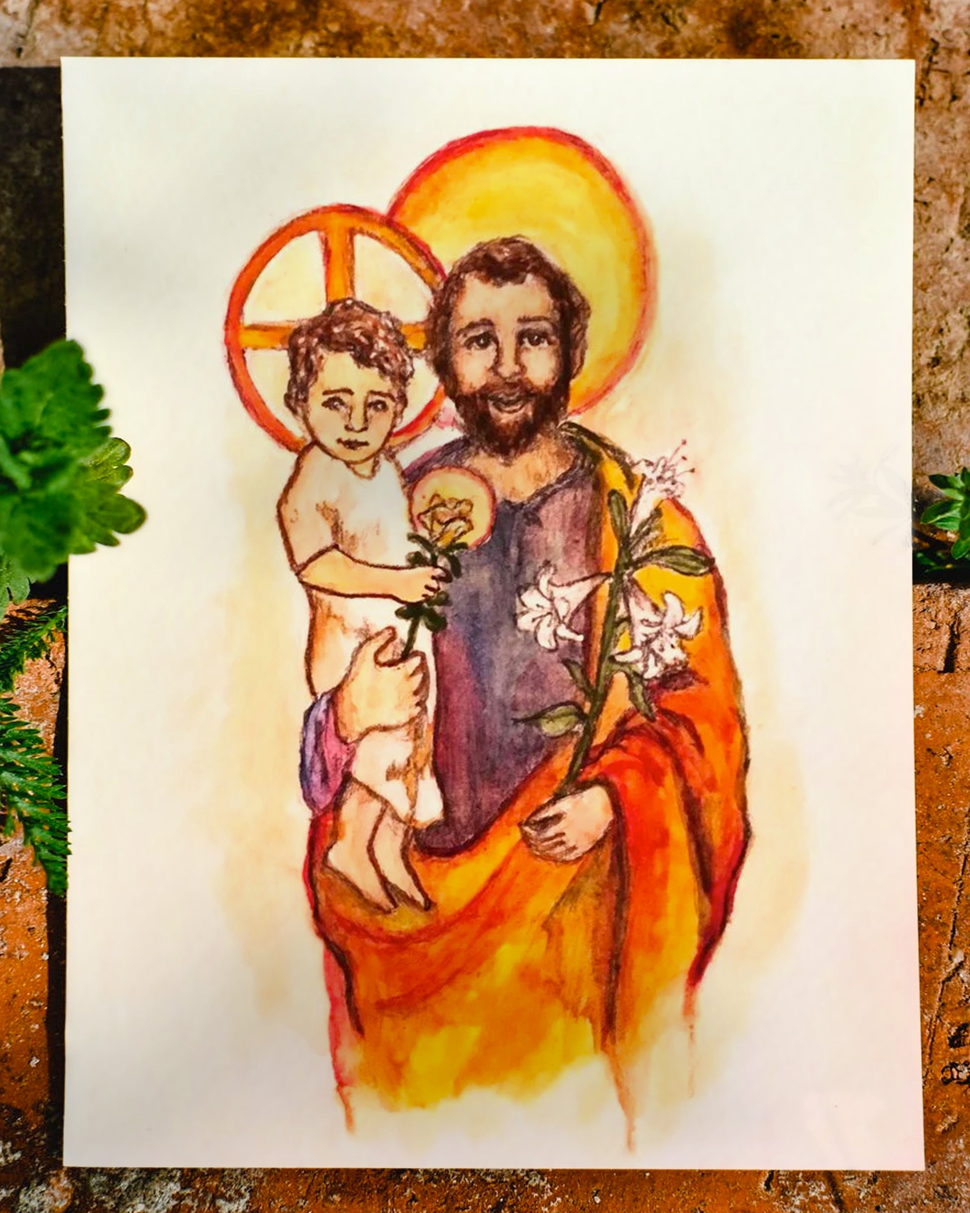 I originally painted this image for a friend who had recently had a miscarriage. She wanted to give an image of Saint Joseph to her spouse on his first Father's Day, knowing it would be hard to celebrate without the joy of their child with them. She asked for Jesus to be holding a rose in honor of their little girl. There is a halo around the rose in honor of the purity and holiness of her life that would spend its entirety in heaven. May God be with you in any loss you may be experiencing, and may we live our lives with the purity and holiness that Saint Joseph did!