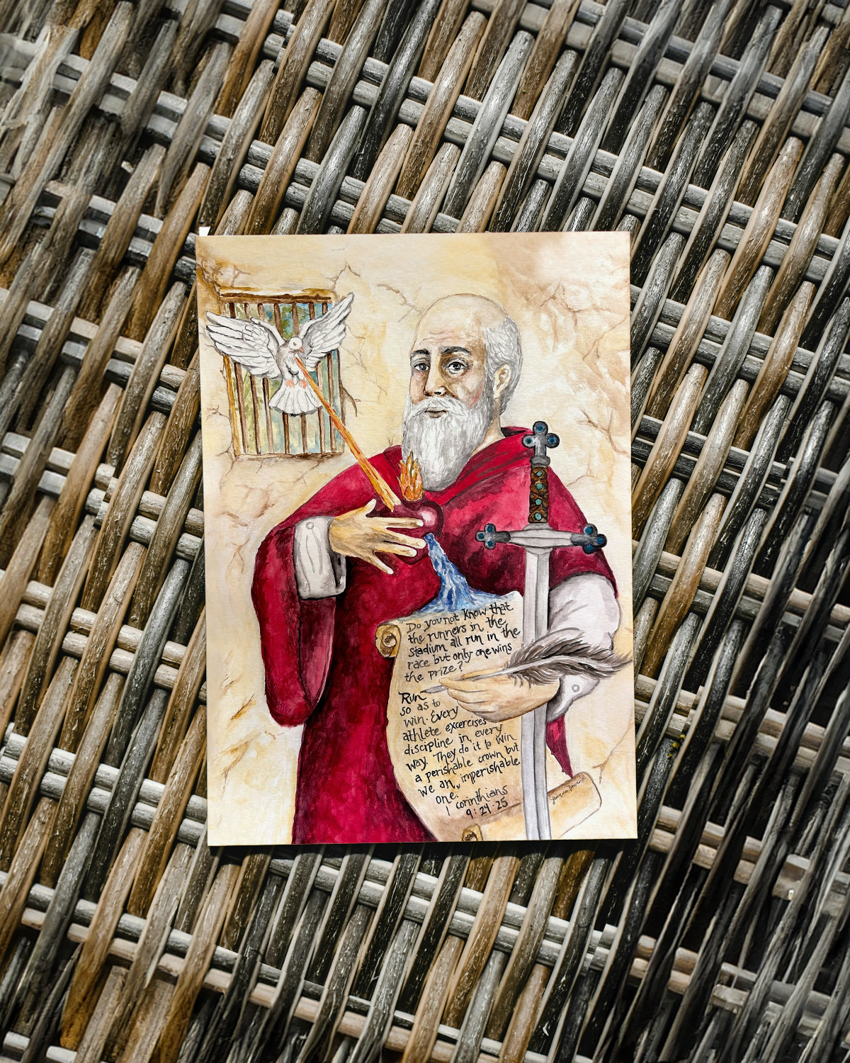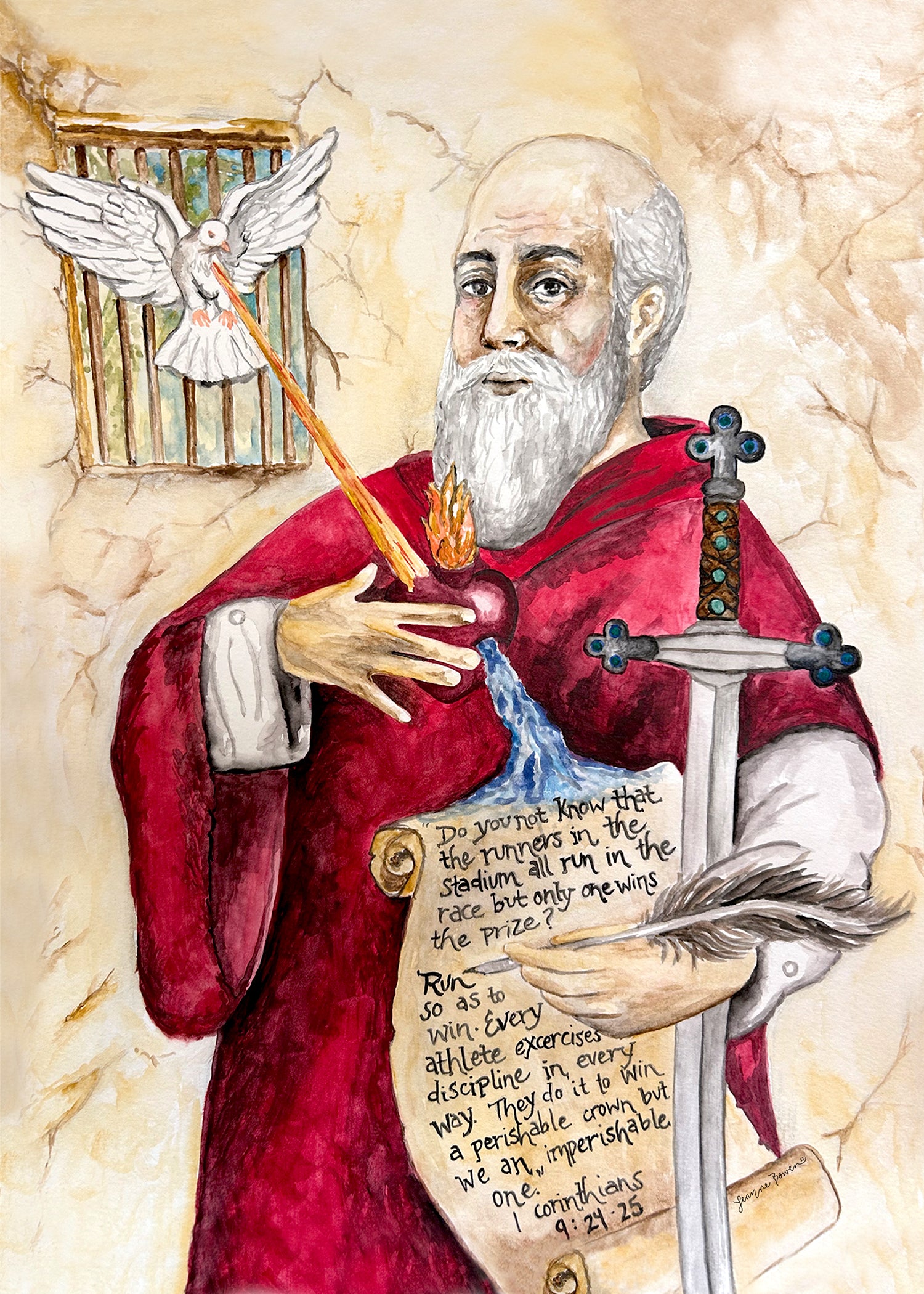 Saint Paul is willing to share the Gospel even when he is imprisoned. Despite opposition and hardship, captivity does not limit the outpouring of the Holy Spirit into his ministry. The quill in his hand shows his constant readiness to minister through his gift of writing. Saint Paul has a sword with him, a reference to his martyrdom and to his previous life as a persecutor of Christians. Having a sword while imprisoned shows the freedom he has within his heart even in captivity. The Holy Spirit bursts forth through the prison bars. The light pierces Paul’s heart with wisdom and immediately pours forth into living water inspiring the Word of God. Paul wears a vibrant red, the color of both the Romans he had served and the passionate love of Christ to which he dedicated the rest of his life.