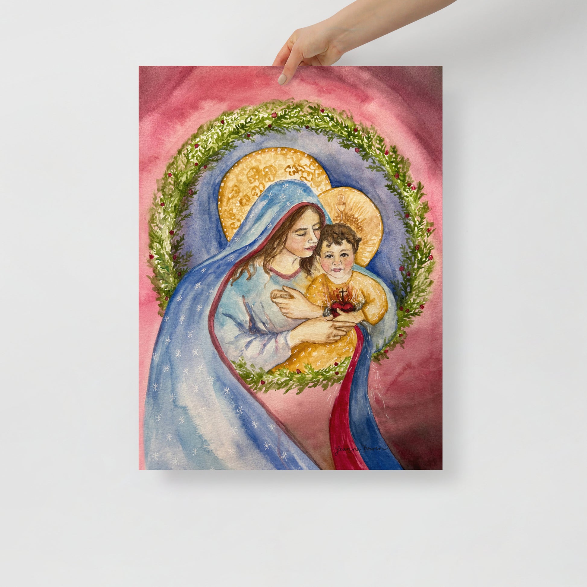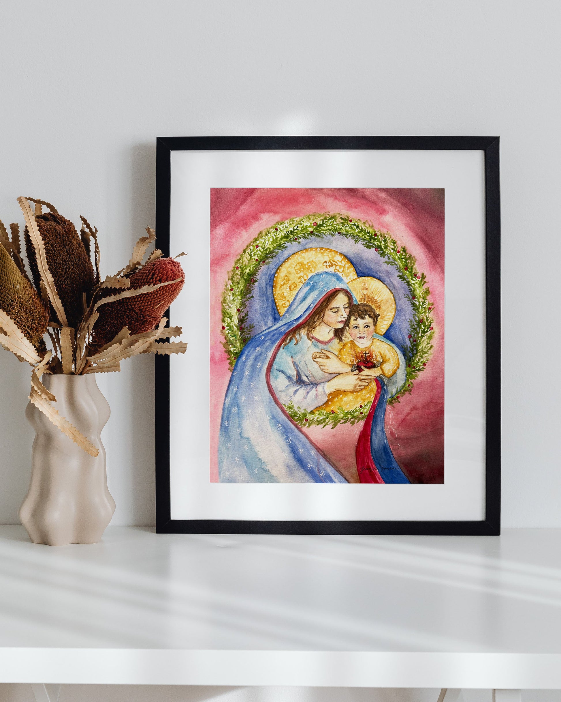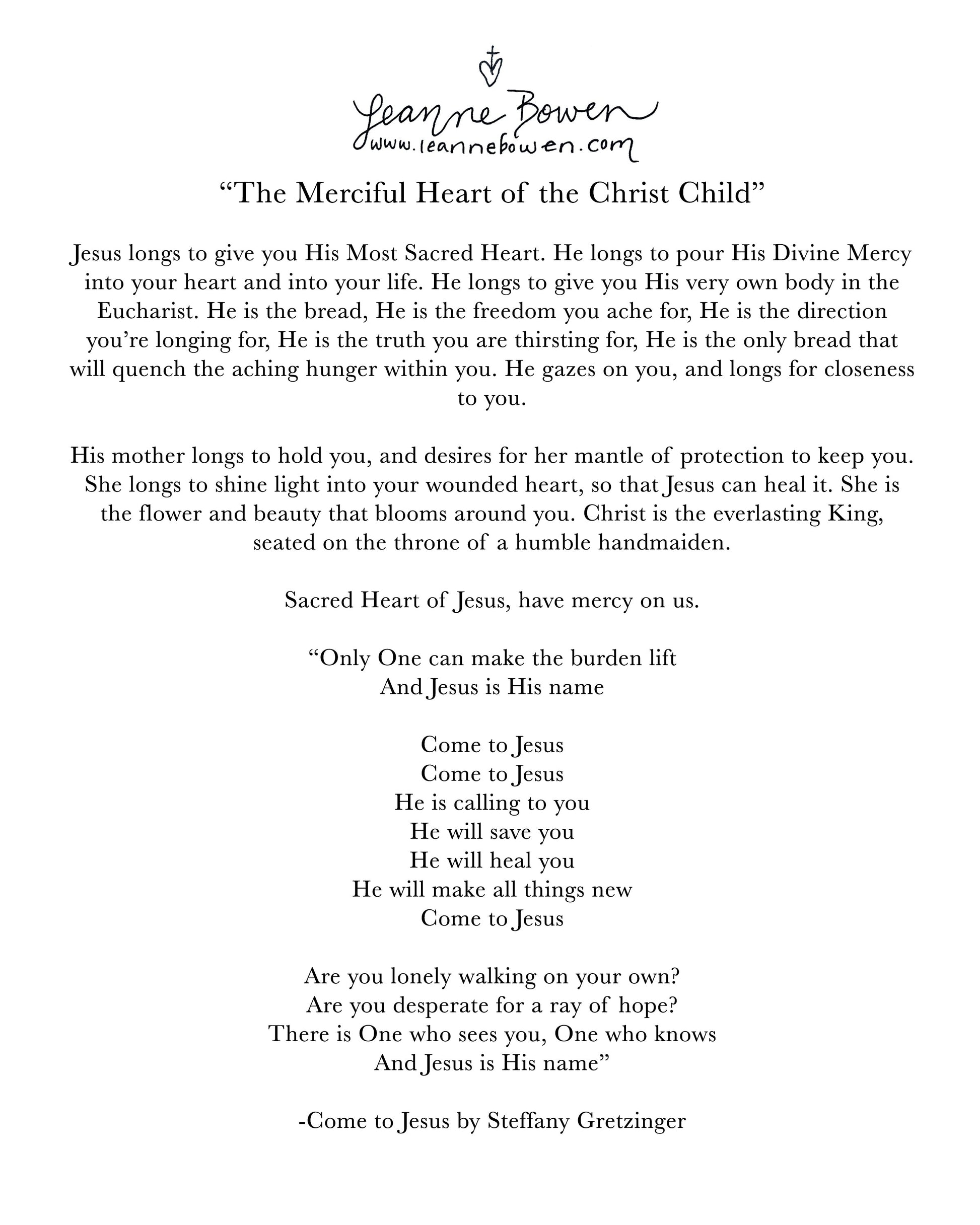 "The Merciful Heart of the Christ Child" is a watercolor print by Leanne Bowen. Frame not included. The 5”x7” and 8”x10” Prints come with the meditation printed on the back. The larger prints do not.