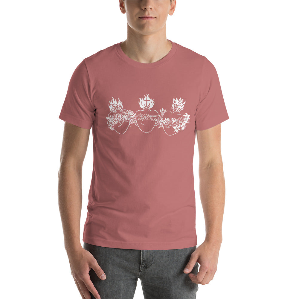 This t-shirt feels soft and lightweight, with the right amount of stretch. It's comfortable and flattering for all. The image shows the Hearts of the Holy Family. Have the Hearts of Mary, Jesus, and Joseph close to you and those you love!